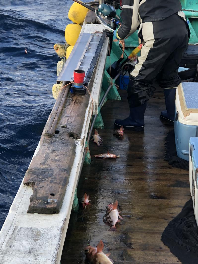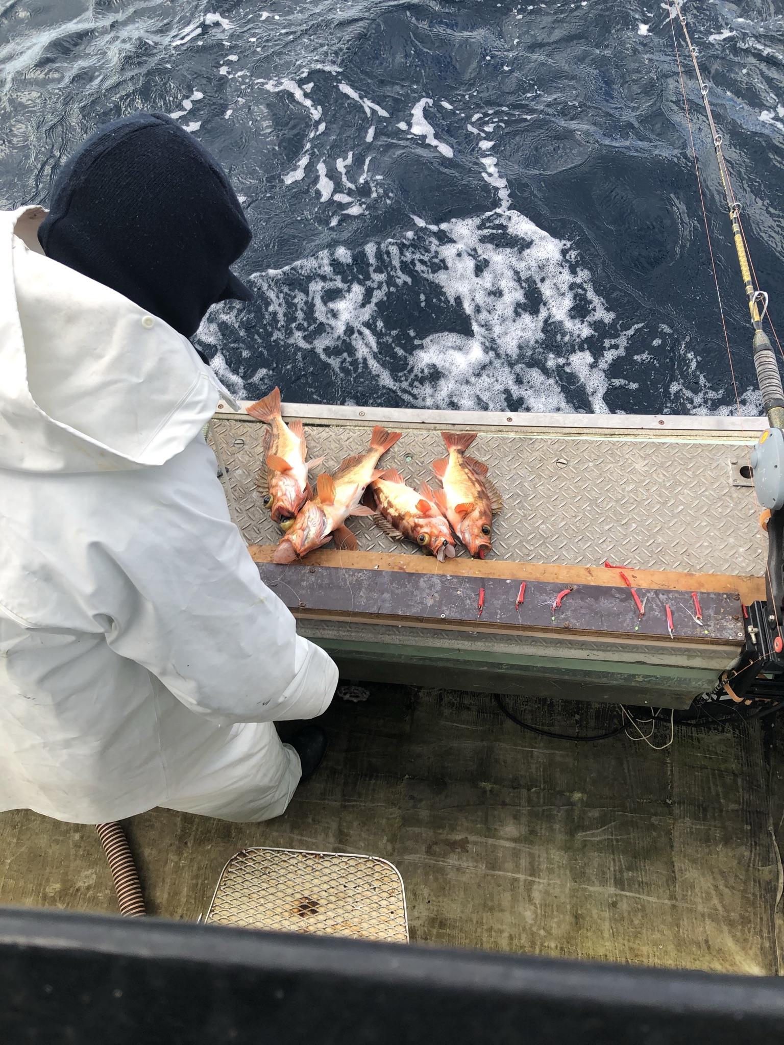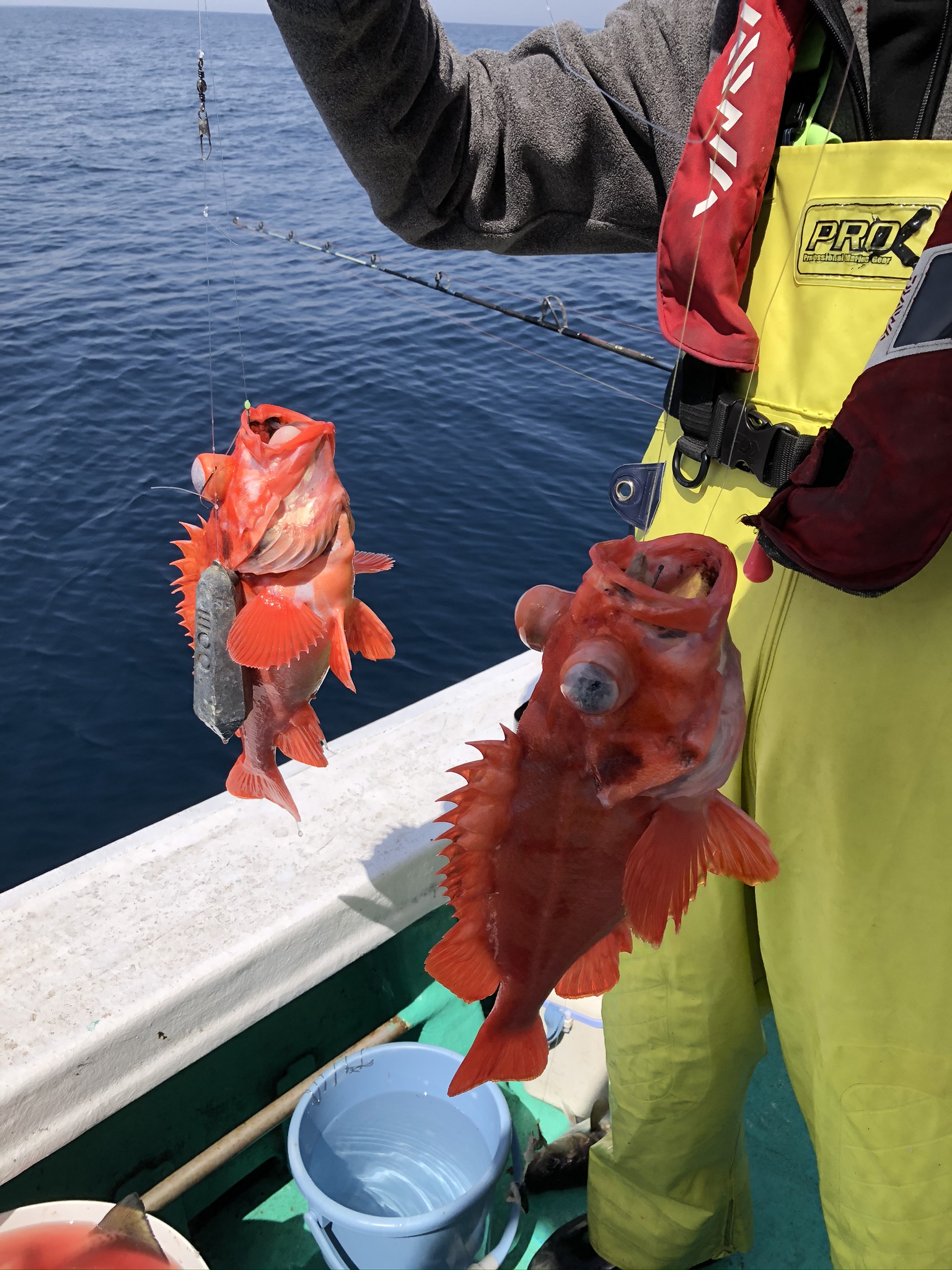 メバル、タラ、ヤナギ、バラメヌケでの出船ですが、一投目からサバの猛攻撃(T . T) 場所移動を繰り返してもサバ!仕掛投入後水深10mから攻撃され、かろうじて底までたどり着けば何とかメバルは型を見れますが、底でもサバの攻撃(底のサバは良型)でやむ無くメバルは諦めて150mラインに移動。ヤナギはあまり荒らされていないのか下せば型は見れます。混じってタラ(マダラ 、スケソウ)、赤魚、バラメヌケも上がってきます。マダラ は白子も入ってきていますので、今後期待です。深場餌、ジグ楽しんでみて下さい。