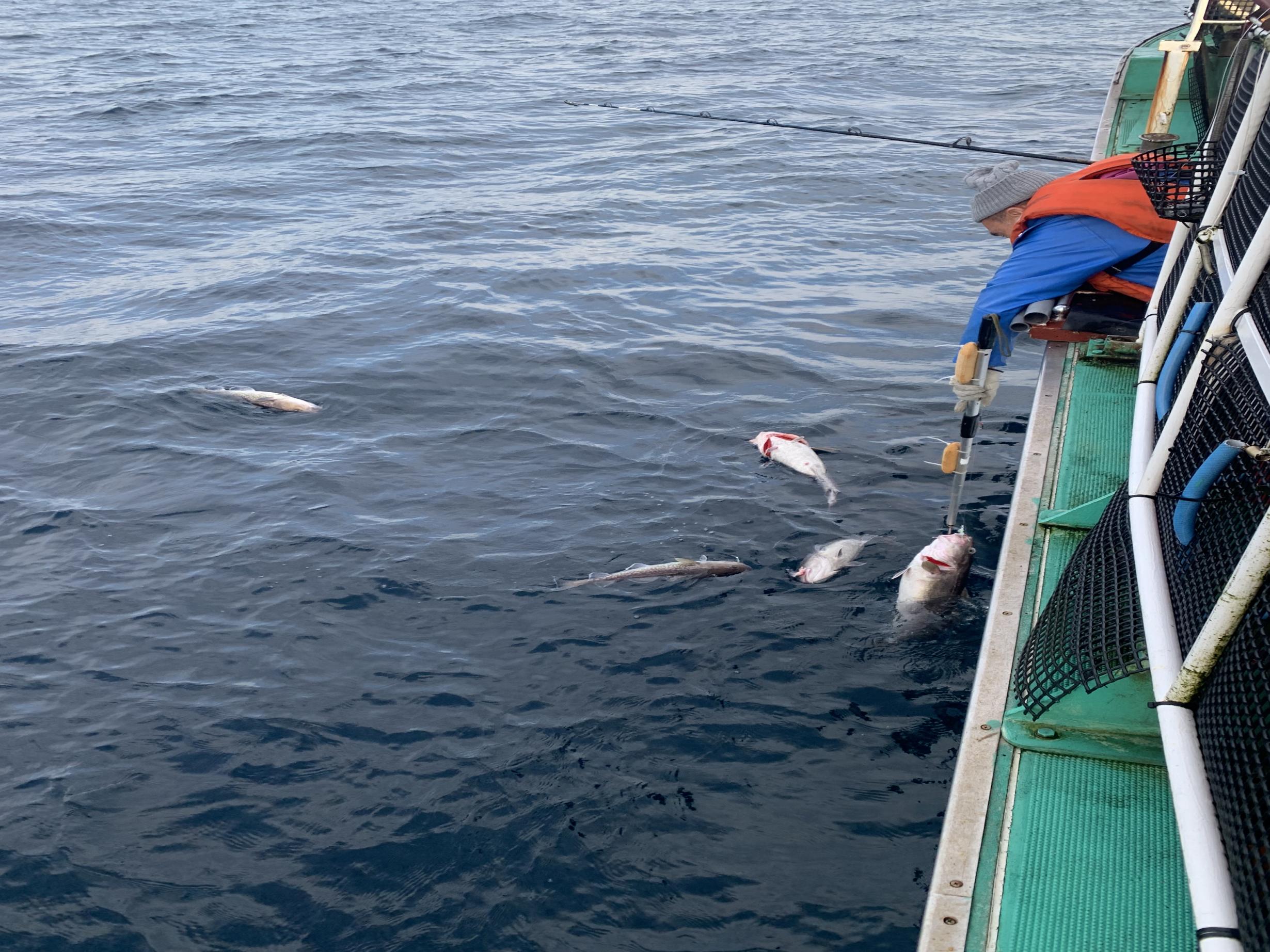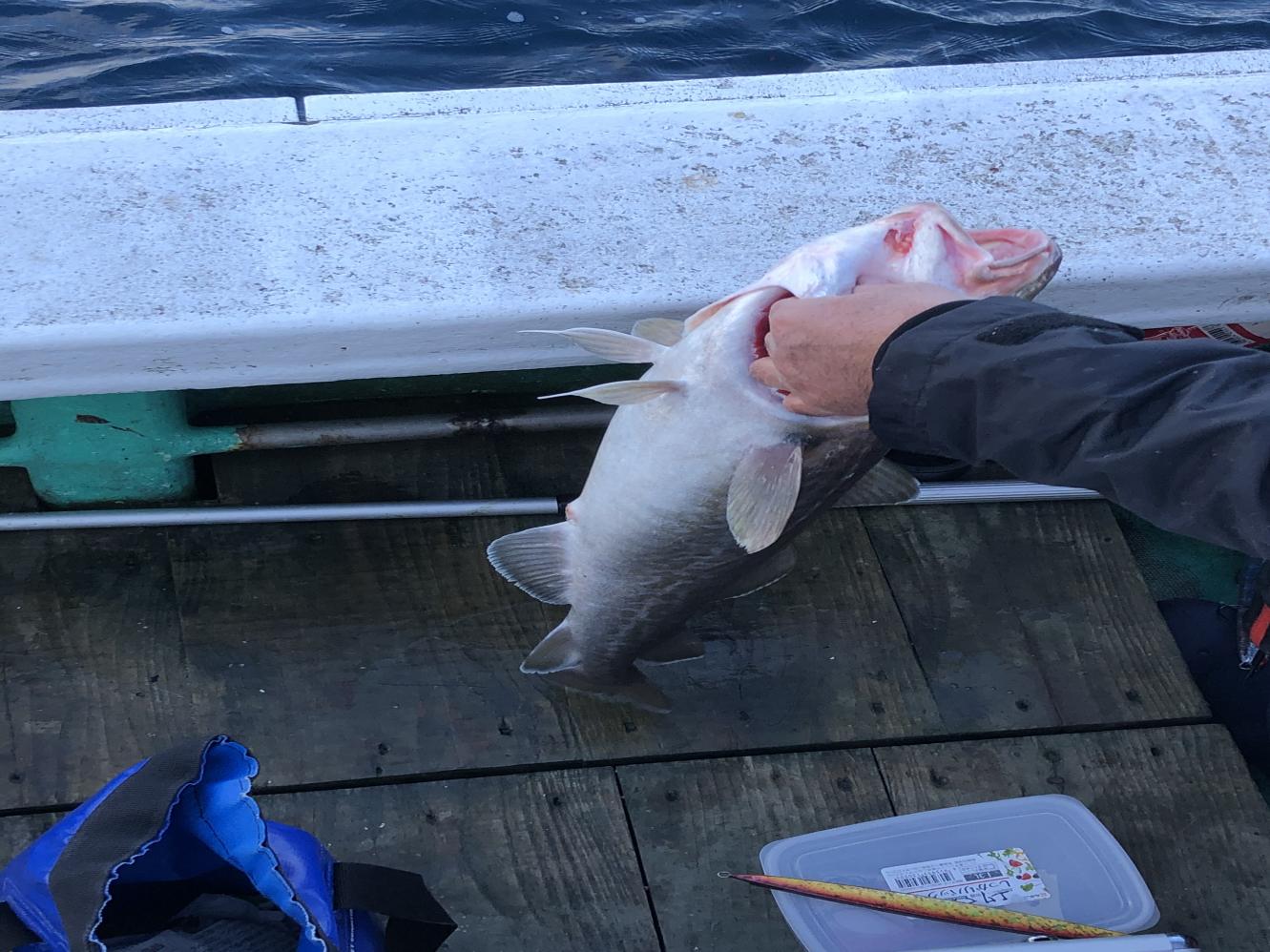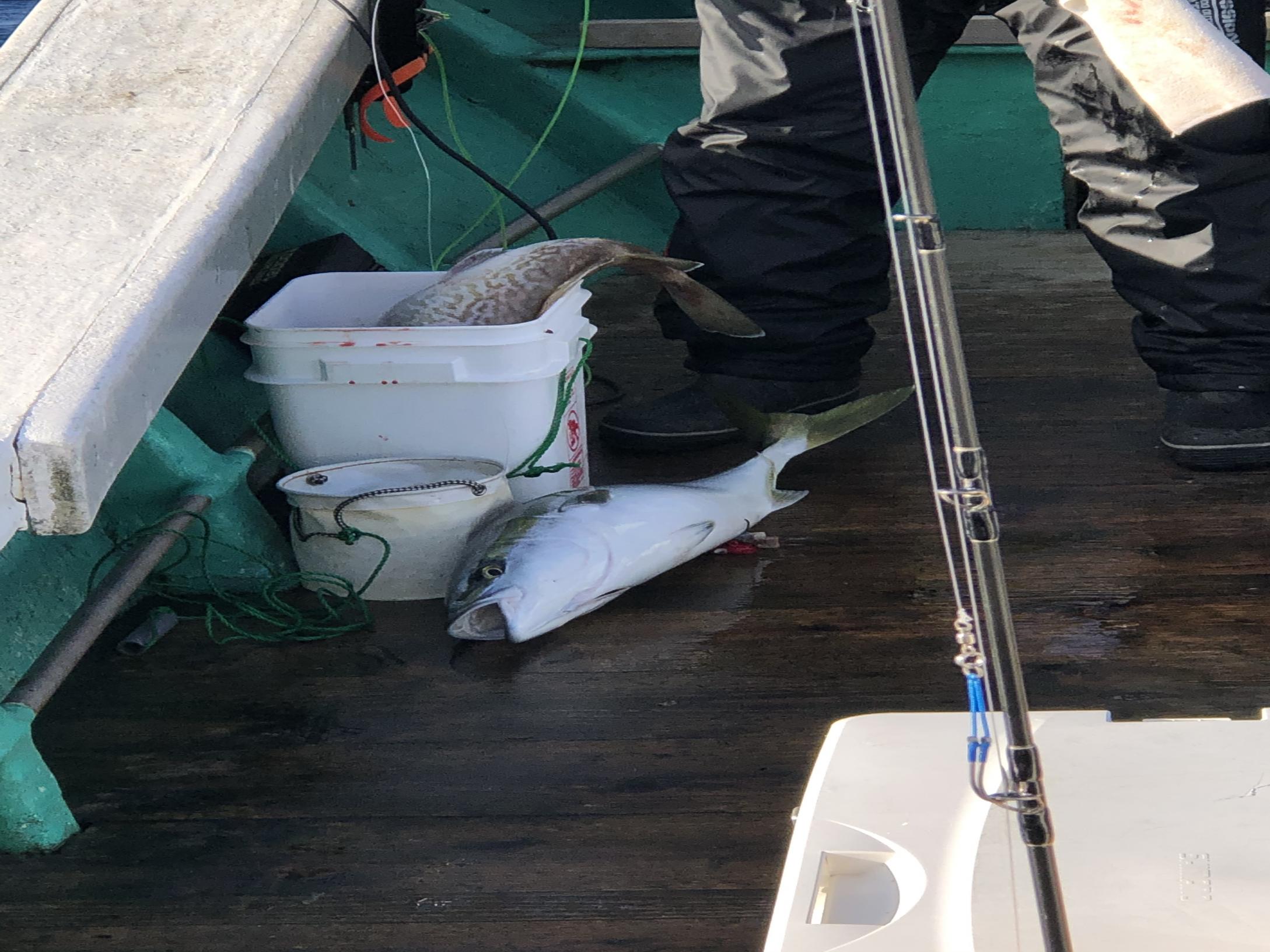 11/3、711月はタラが上向くかと思いきや?餌釣りタラは食い渋りが続いてました。型は良型ですが竿頭でも10本と伸び悩みです。隣の船はジグで忙しく拾ってますが(隣の船の話ではジグ好調との事)羨ましく眺めていました。条件良ければ赤いゲストも釣れますので楽しんでみて下さい。タラは白子も入ってきてますので今後を期待し各ポイント攻めたいと思ってます。90mラインの青物狙いは11/7はブリ、ワラササイズが27本/6人と満足の釣果。