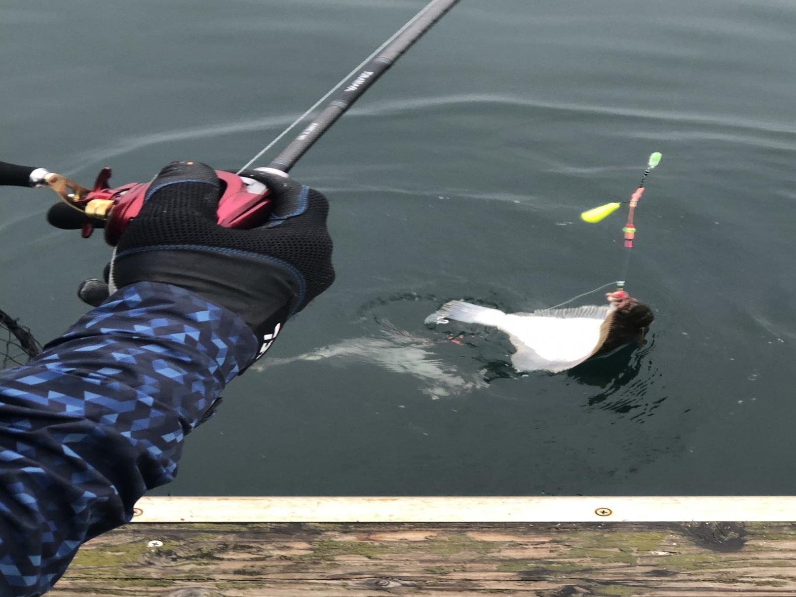 5月に入りマコガレイも場所によっては良型の割合が多くなって来ています。数的に上がる場所もありますがポイントが狭すぎる感じで、まだ本調子までとは言えませんが徐々に上向いてきてます。水温も低く、濁りもある為、水中ライトは必須かも?誘いもリズム、テンポを状況により変化させて狙ってみて下さい。