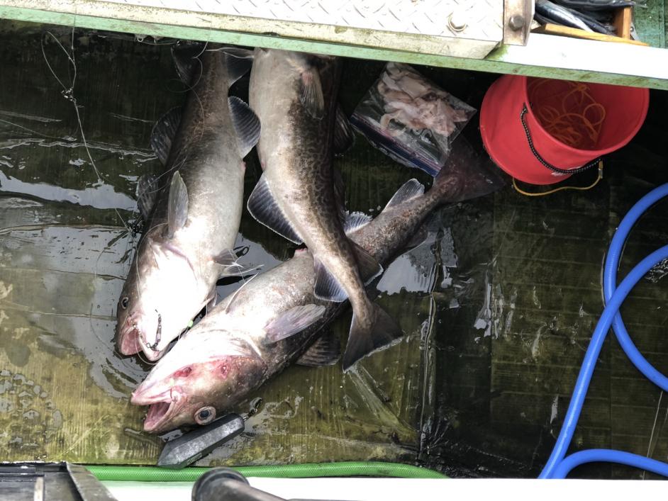 10月後半からタラ釣りで出船していますが、凪が使えない事と潮が早い日が多い釣行となってました。型は不揃いですが小さいながら白子は入っています。